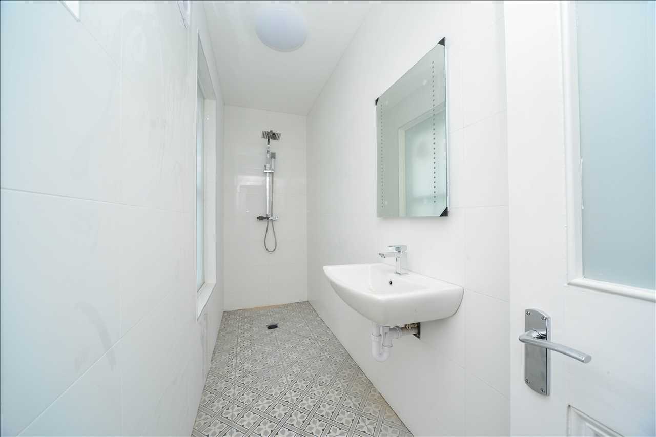 Fitted in white with chrome fittings and comprising panel bath with over bath chrome shower and glazed shower screen. Pedestal basin and close coupled flush WC. Auto extractor fan. Chrome heated towel rail/radiator,