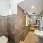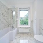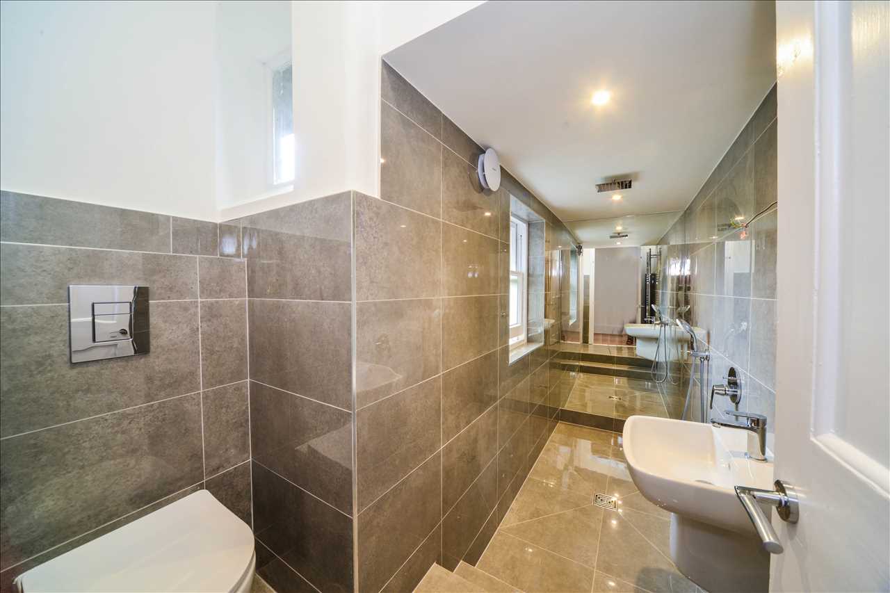 Fitted in white with chrome fittings and comprising panel bath with over bath chrome shower and glazed shower screen. Pedestal basin and close coupled flush WC. Auto extractor fan. Chrome heated towel rail/radiator, Sash window.