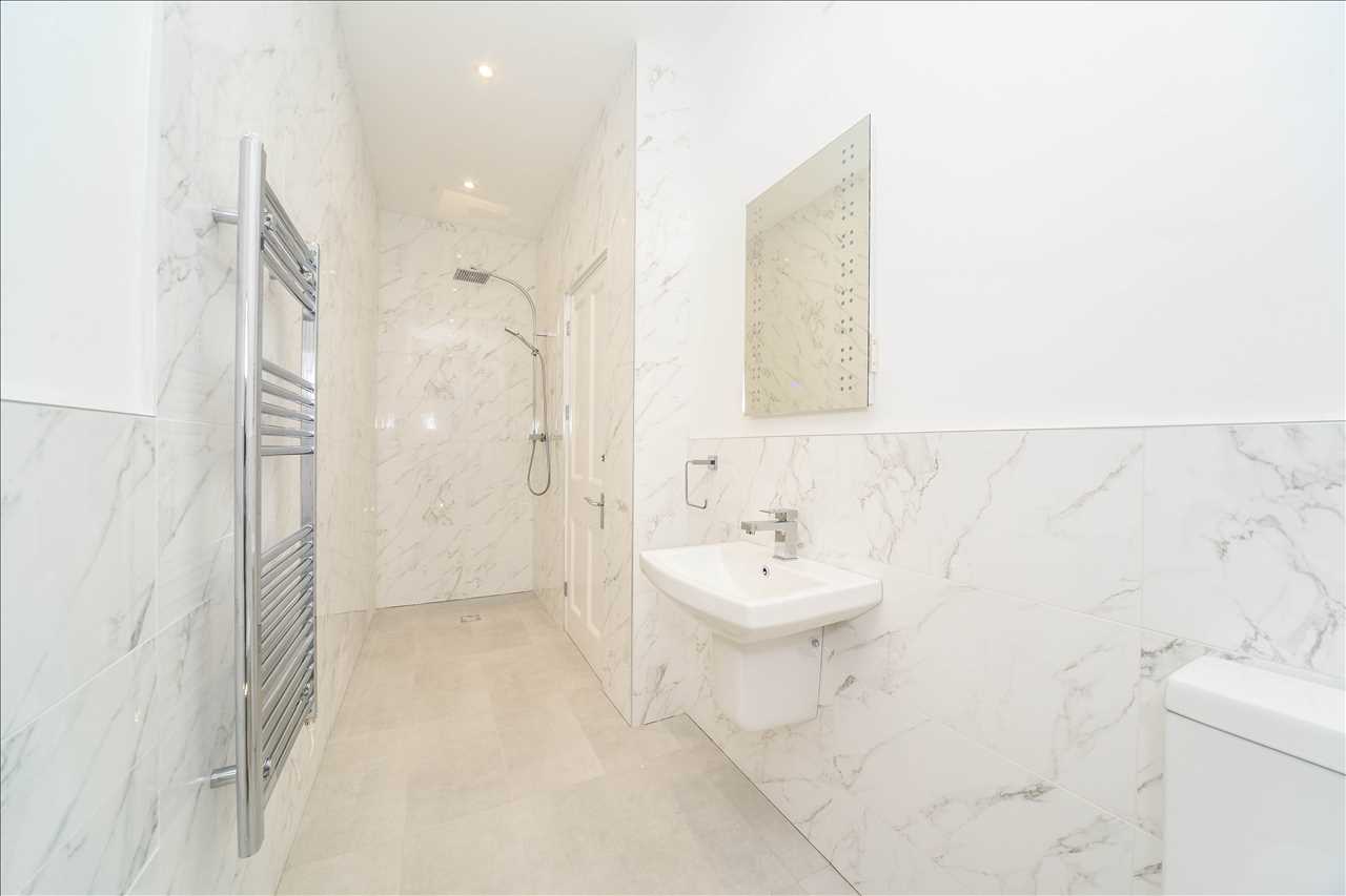 Fitted in white with chrome fittings and comprising walk in "wet shower". Wash basin and close coupled flush WC. Auto extractor fan. Chrome heated towel rail/radiator,