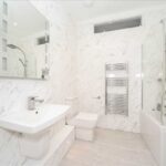 Fitted in white with chrome fittings and comprising panel bath with over bath chrome shower and glazed shower screen. Wash basin and close coupled flush WC. Auto extractor fan. Chrome heated towel rail/radiator,