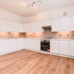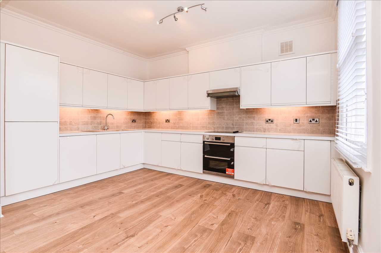 Sash window. Fitted in a comprehensive range of wall base and drawer units finished in high gloss white with contrasting work tops and tiled splash backs. Integrated stainless steel oven, electric hob and concealed extractor. Stainless steel sink and drainer. Integrated full height fridge freezer, washer dryer and dishwasher.