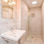 A white suite with chrome fittings comprising shower cubicle. Wall hung basin. Close coupled flush WC