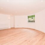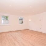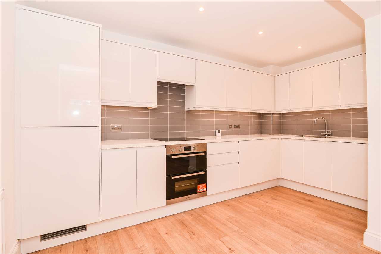 Fitted in high gloss white with contrasting work tops. Integrated washer dryer, dishwasher and full height fridge freezer. Stainless steel oven. Ceramic hob and concealed extractor above. Wood laminate flooring.