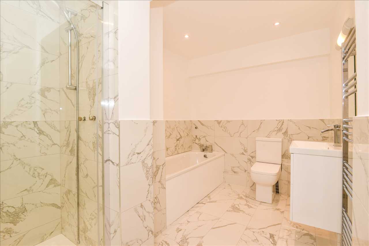 Fitted in white with chrome fittings and comprising large glazed shower cubicle and panel bath. Basin with storage and close coupled flush WC. Auto extractor fan.